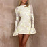 Crafted from intricate floral brocade, the Evangeline Dress is a dream of modern romance. Its slim, A-line silhouette flatters the figure, while dramatic flare sleeves and delicate hollow-out details add a touch of captivating allure. This is the dress for making a memorable entrance, designed for evenings filled with confidence and enchantment. A true masterpiece of texture and form.